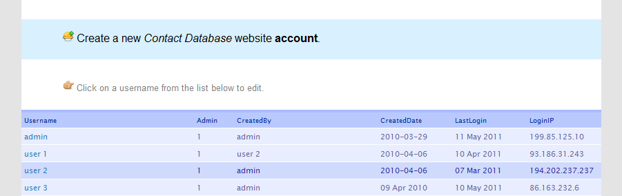 It is possible, with administration priviledges, to quickly and easily manage all system users. You can create, edit and view important details like last login time about specific database users. You can grant permissions based on operational region, change passwords and apply email addresses used to send out information about new sales leads and contact notes.
